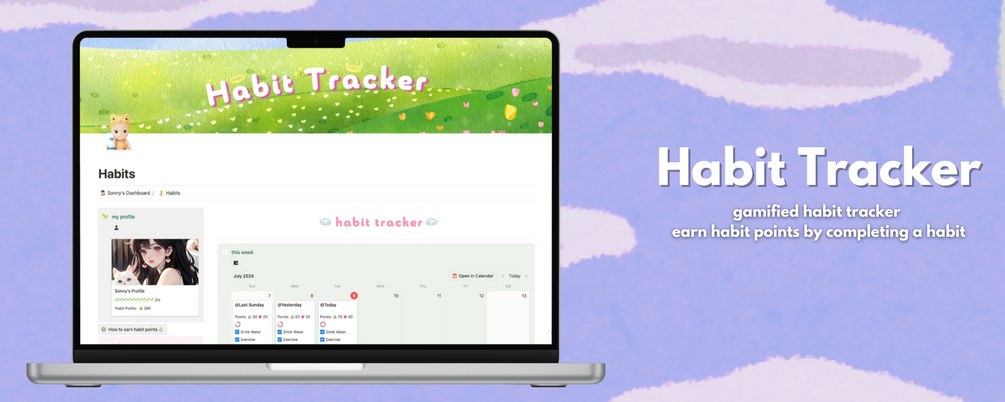 Elevate your planning routine with the Sonny Angel Gamified Life Planner! This all-in-one easy to use Notion template blends the charming Sonny Angel theme with a comprehensive life planner to help you stay organized and motivated. Make tracking your daily progress fun by earning Life Points as you log your daily moods and habits!